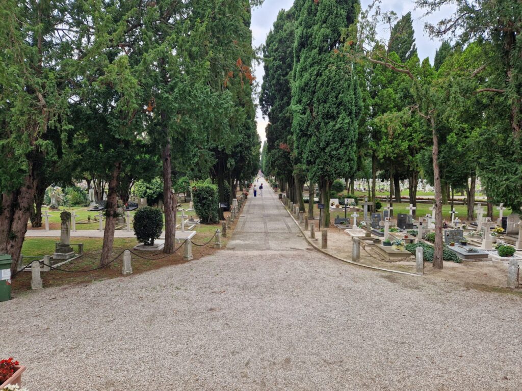 Gerade dieser Kontrast macht den besonderen Charakter von San Michele aus. Die dicht übereinandergestapelten Grabkammern erzählen von Platzmangel und der engen Verbindung zur Stadt Venedig, während die offenen Grabfelder und die ruhigen Wege mit Zypressen Raum zum Innehalten bieten. Trotz der ungewohnten Struktur wirkt der Ort nie bedrückend – eher ruhig, geordnet und auf eine besondere Weise würdevoll.